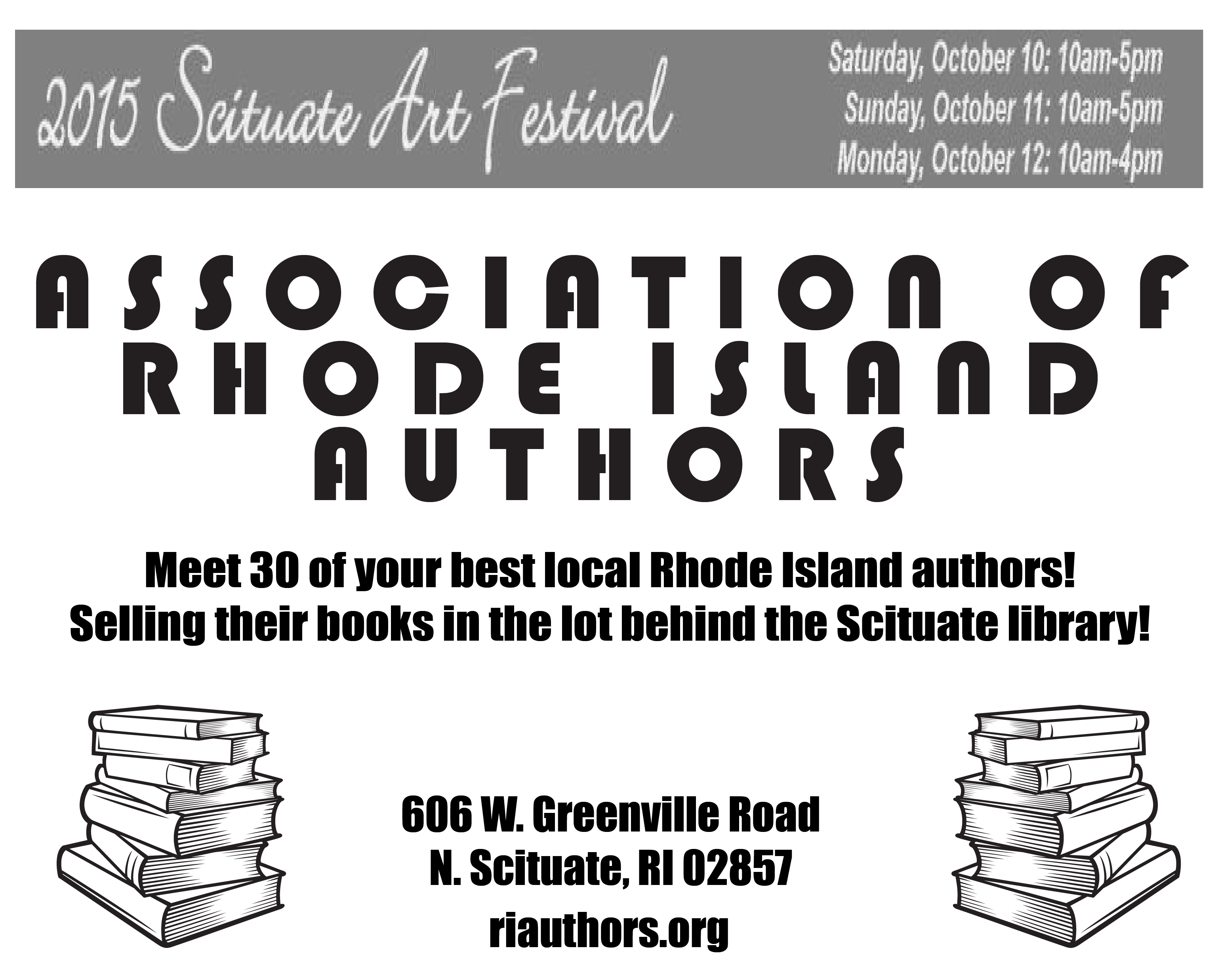 Once again, over 30 of your favorite RI authors will be set-up behind the North Scituate Public Library to sell and sign books during the Scituate Art Festival on October 10, 11 and 12. Come check-out all the great books written here in RI!