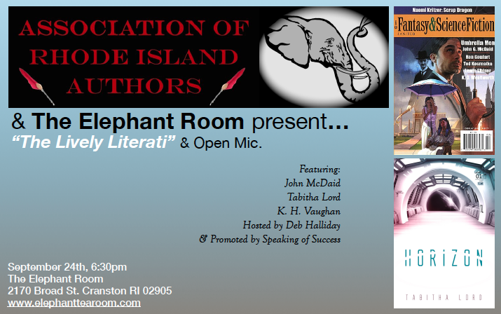 Join science fiction authors and writers Tabitha Lord, John McDaid and K.H. Vaughan at Cranston’s Elephant Room on Thursday, September 24th at 6:30 p.m. for the September edition of “The Lively Literati.” Science Fiction will be this month’s theme, and following presentations from our featured writers, the mic will be opened to the audience to share any style of poetry, prose or short creative work. Admission is free!
