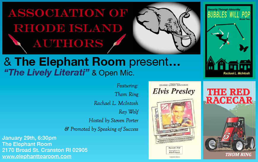 Please join ARIA as we welcome authors Adele Bourne, Sara Low and Gail Eastwood to The Elephant Room, 2170 Broad Street in Cranston, for February’s edition of “The Lively Literati” on Thursday, February 26th at 6:30 p.m. The event will be hosted by author and ARIA President Steven R. Porter
