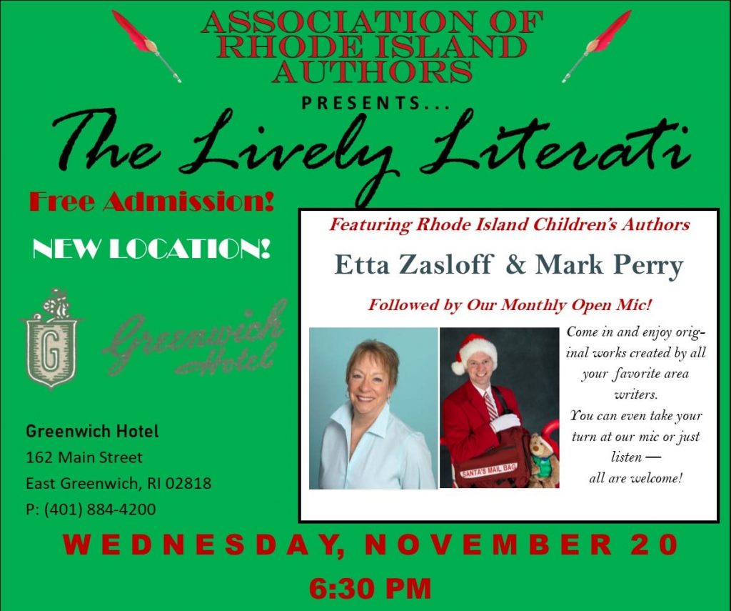 Please join us at Greenwich Hotel and Lounge on ever popular Main Street in beautiful downtown East Greenwich as Association of Rhode Island Authors (ARIA) presents the Lively Literati. Back by popular demand, Lively Literati will feature Etta Zasloff author of Beginning with Xs and Os and North Pole Postman aka author Mark Perry.